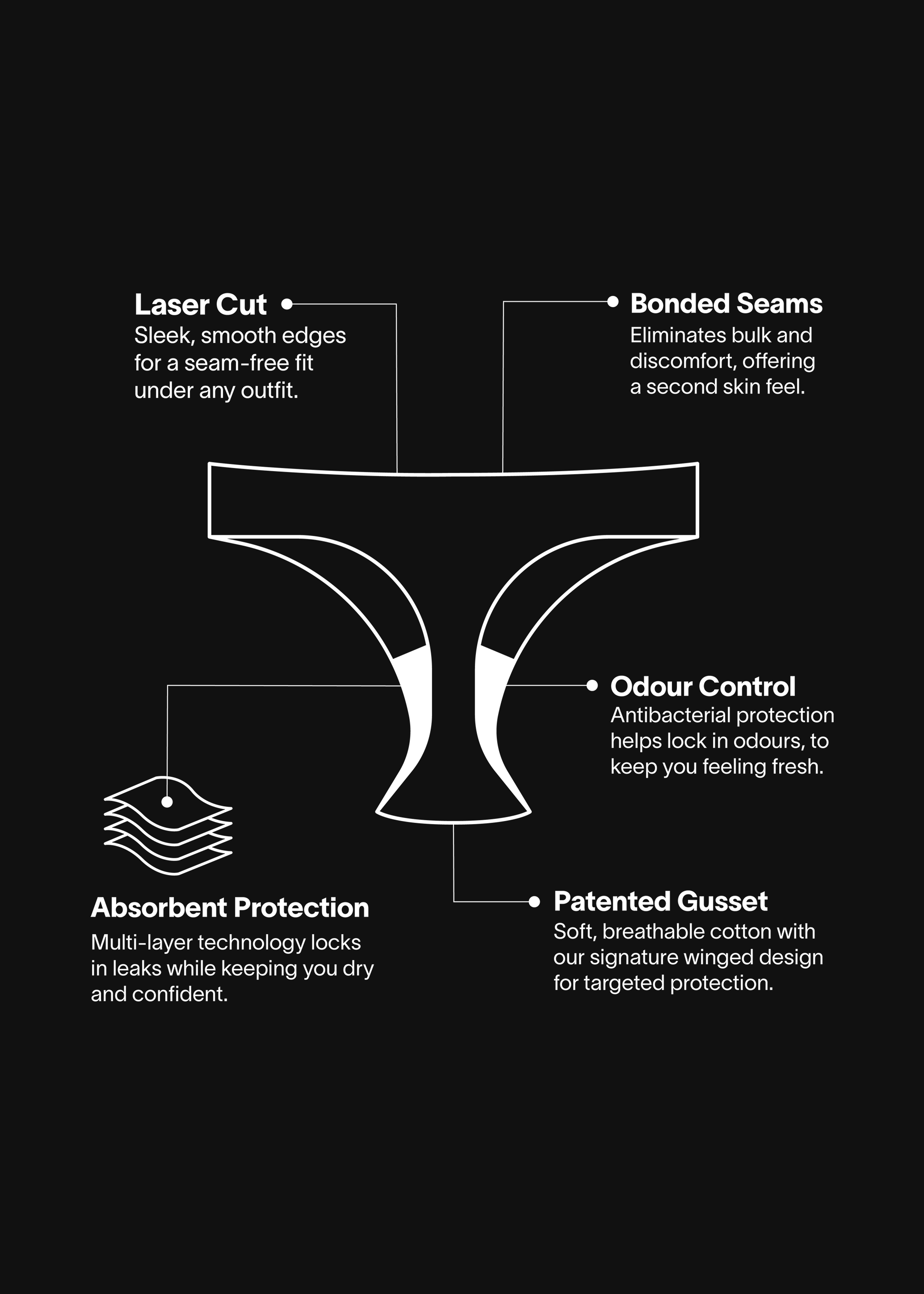 - Absorbent protection for leaks, sweat and periods